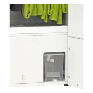 Die Wärmepumpe verteilt über die Öffnungen in der Rückwand einen regelmässigen Trockenluftstrahl ins Innere des Trockenschrankes. Die entzogene Feuchtigkeit wird in einem leicht zu entleerenden Auffangbehälter unterhalb des Schrankes aufgefangen. Mittels eines Schwimmers meldet der Trocknungsschrank automatisch, dass der 2-Liter-Behälter entleert werden muss. Alternativ kann der Auffangbehälter für die automatische Entleerung über einen Schlauch an das Abwassersystem angeschlossen werden.
